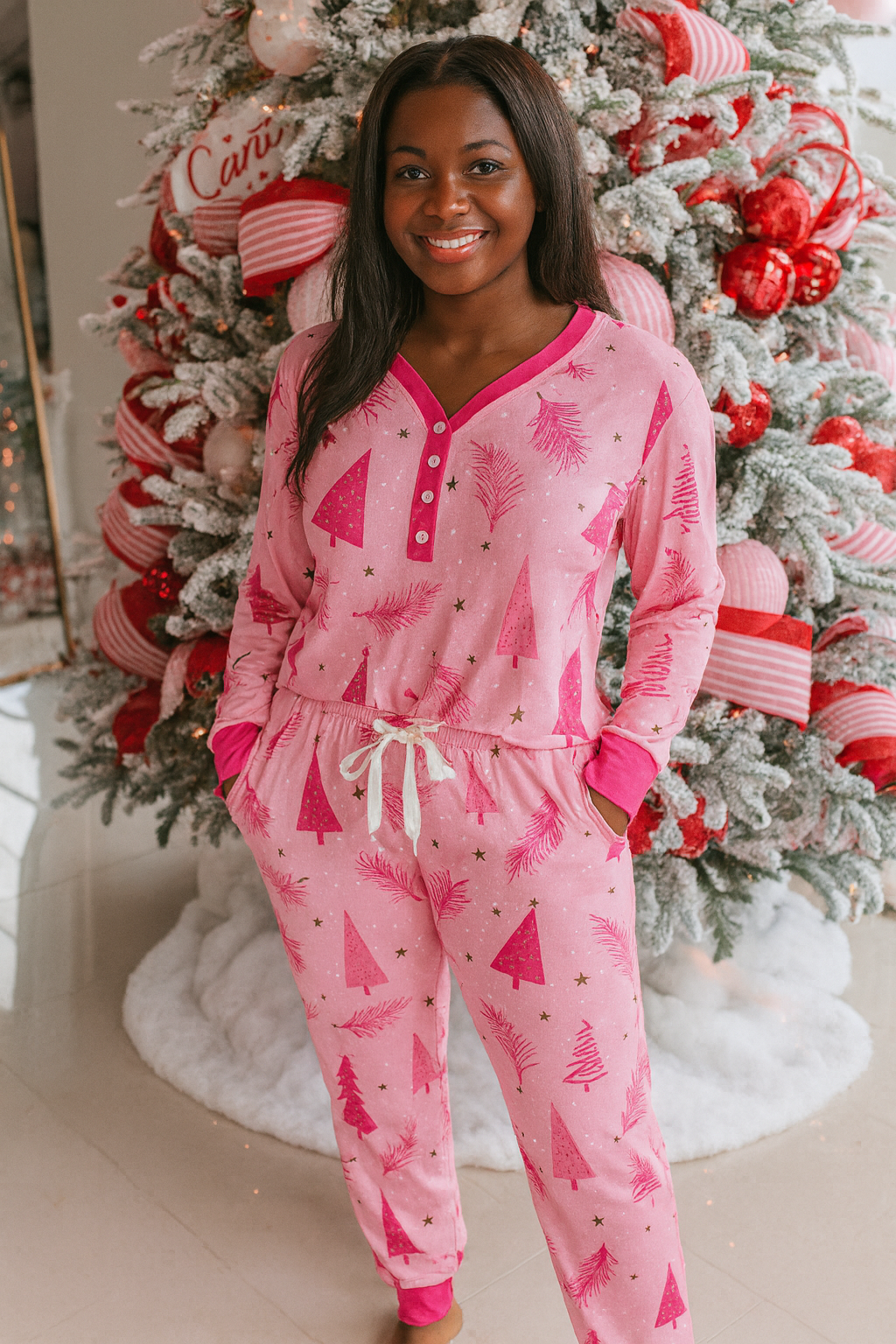 Covered in a playful pink Christmas tree print, it’s giving festive-but-make-it-fashion. Whether you’re relaxing at home, filming holiday content in fuzzy socks, or wrapping gifts with Mariah on full blast this is the set you’ll want to live in all seasons long.